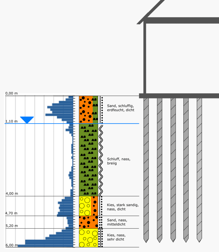- Gründungsempfehlungen: Es werden mögliche Einflüsse und Risiken diskutiert und Vorschläge zur Art der Gründung und Abdichtung gemacht.